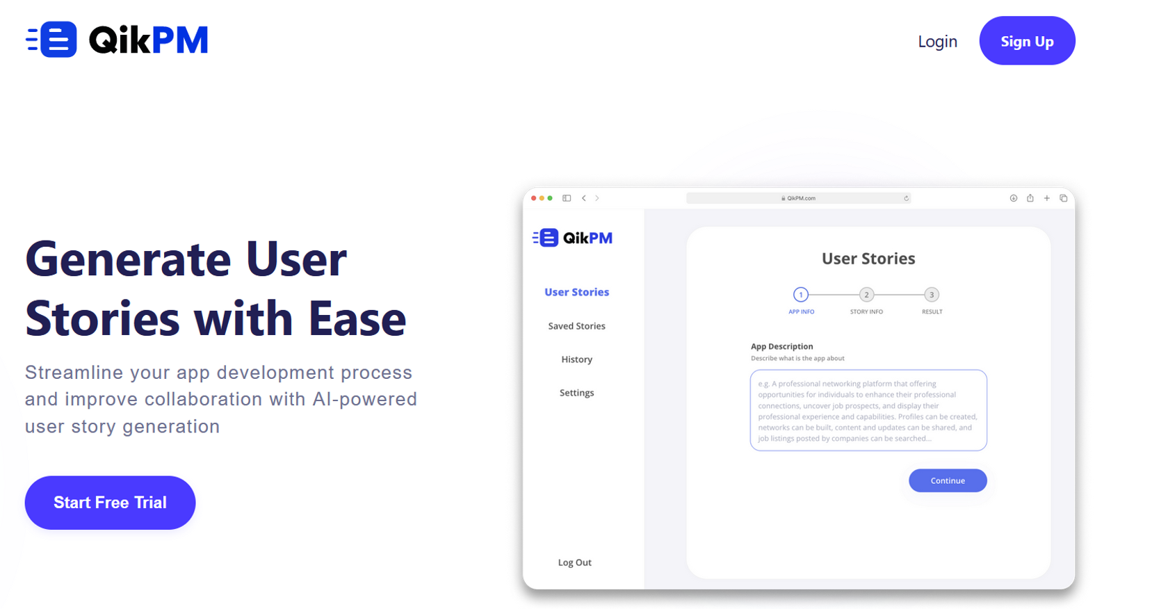 QikPM generates comprehensive user stories from simple user story input and app description. Use the tool to effectively write user stories for developers. Highlight the AI-powered capability of the app to generate user stories with just a few clicks, saving
