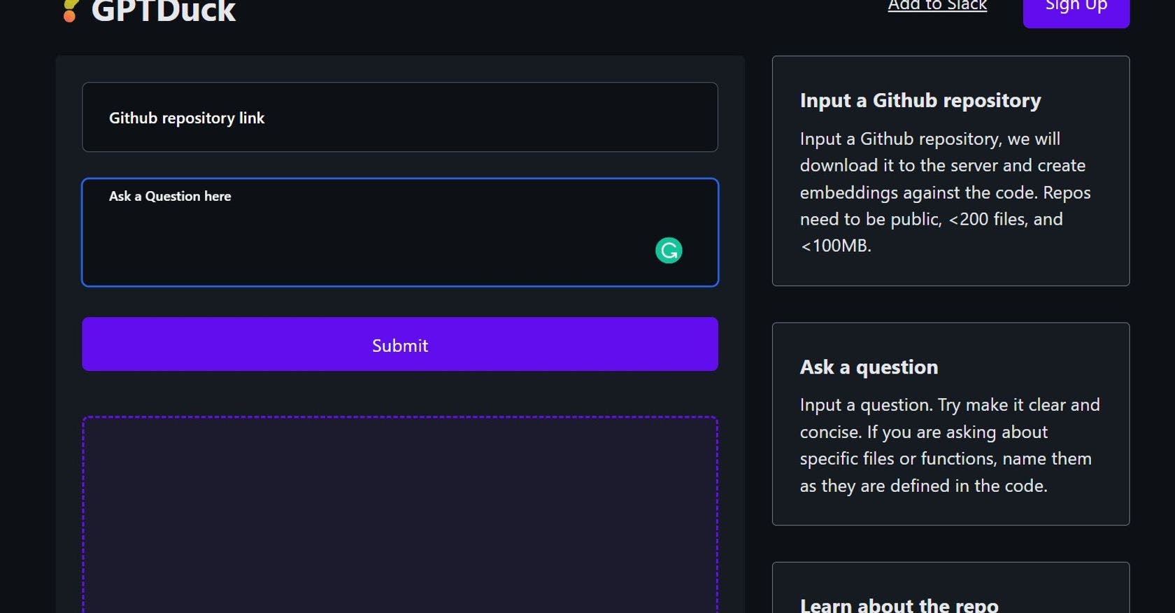 Question answering against any Github repository. Input a Github repository, we will download it to the server and create embeddings against the code. Repos need to be public, <200 files, and <100MB. https://youtu.be/7h66YnqhTM8