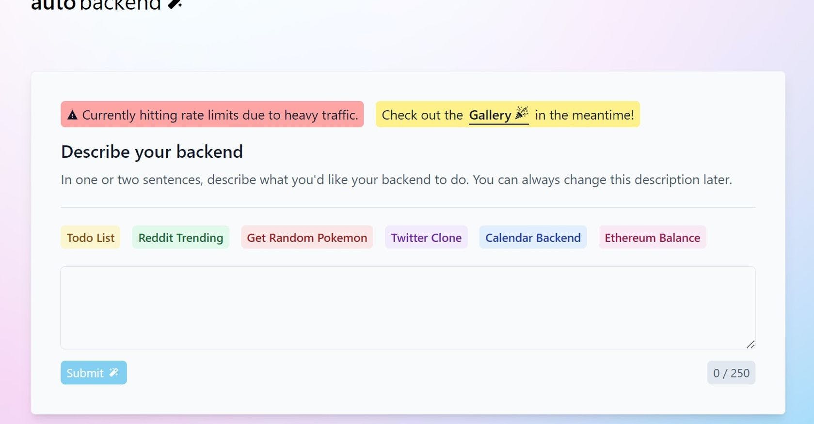 Describe what you'd like your backend to do in one or two sentences. You can also browse apps created by others in the gallery section of the website.