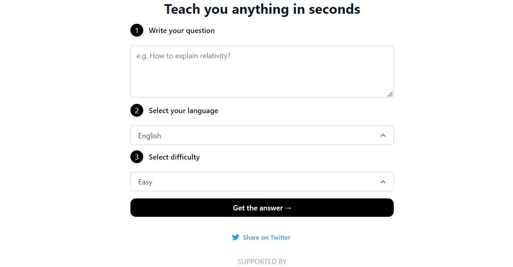 Quickly find answers to questions about any topic. You have to write their questions, choose a language, and the difficulty level. After that, they will get the answer.