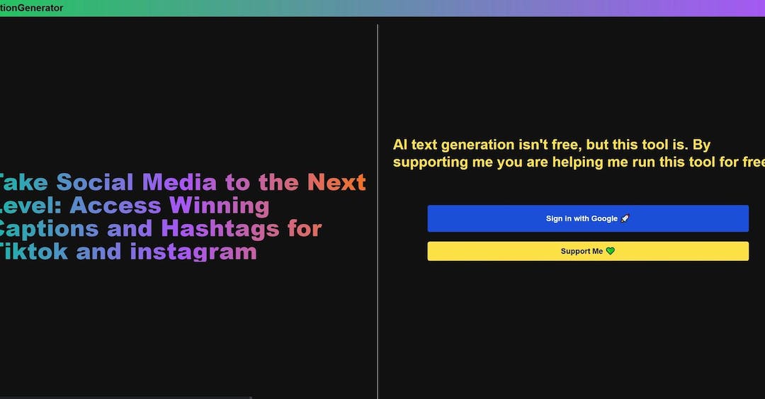 Generated winning social media captions and hashtags. CaptionGenerator is an AI-powered tool that empowers TikTok and Instagram users to enhance their social media game by generating engaging and effective captions and hashtags for their posts.