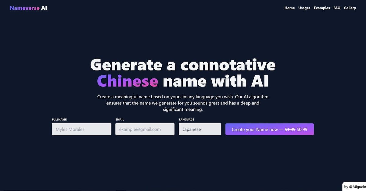 Generated names for businesses/individuals. Nameverse AI is an innovative app that utilizes AI algorithms to generate unique and meaningful names in multiple languages. It offers a convenient solution for users to create culturally rich and original names without the need for