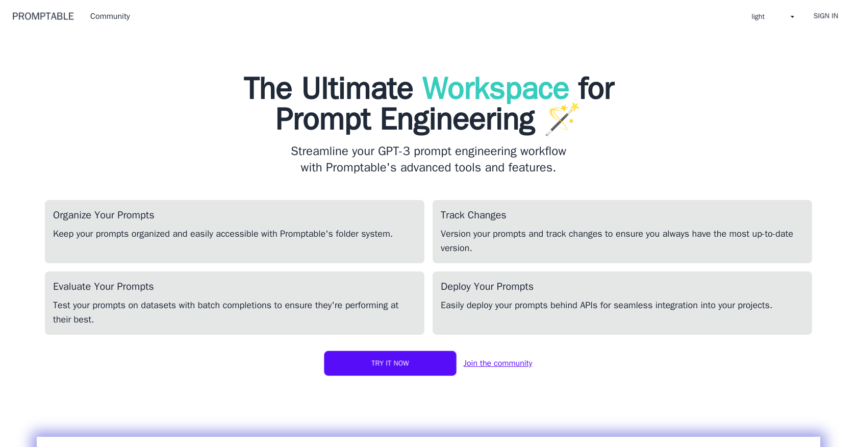 Streamline your GPT-3 prompt engineering workflow with Promptable's advanced tools and features. You can also organize your prompts, track changes, evaluate and deploy your prompts. There is also a community associated with it.