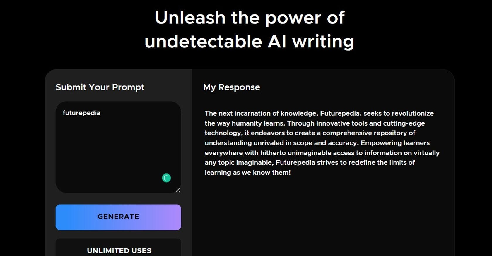 Our proprietary filter allows users to submit prompts and receive response back from GPT3 in a unique manner that is very difficult to detect. We are working on several different usecases, involving long form content creation as well as narrowed
