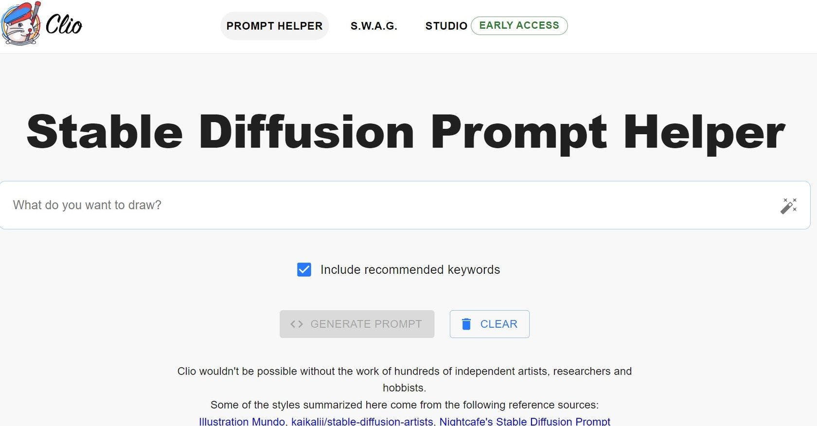 A Stable Diffusion Prompt Generator, which helps people create stories, art, and music by providing them with prompts. Through this website, users can access a Prompt Helper, S.W.A.G. (which stands for Story Writing Assistance Generator), and a Studio to create