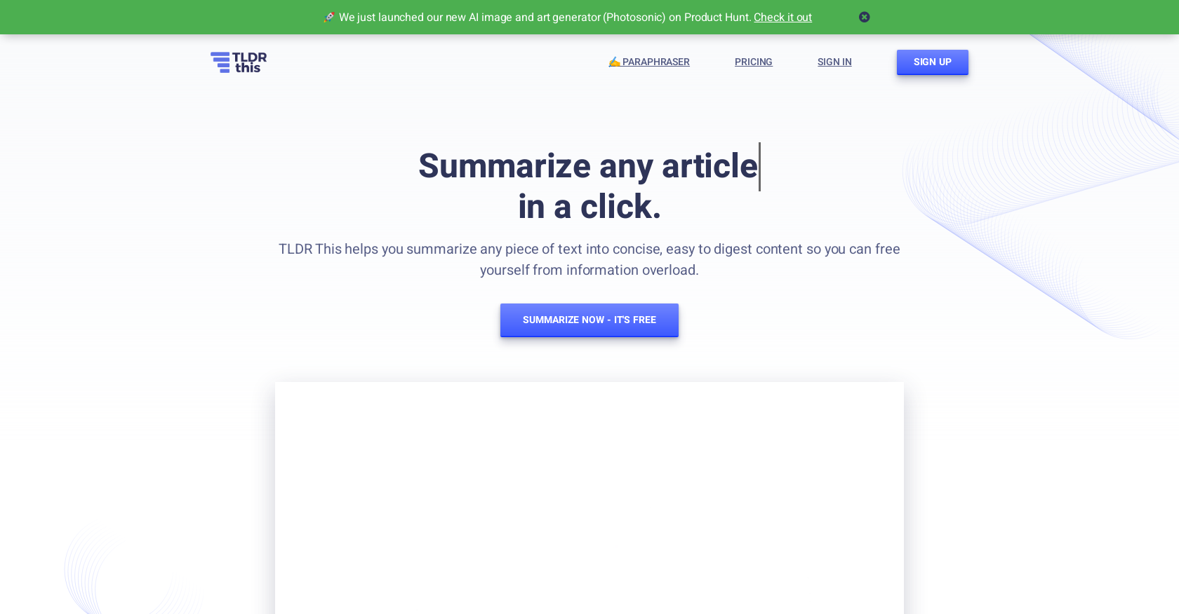 TLDR helps you summarize any piece of text into concise, easy to digest content. Free yourself from information overload. https://youtu.be/GvaqNQ8aHw0